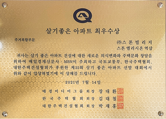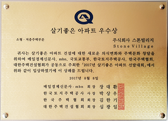 살기 좋은 아파트 건설을 유도하며, 동시에 살기 좋은 아파트에 대한 표준을 제시하고자 시작하게 된 살기좋은 아파트 선발대회에서 최우수상에 선정되었습니다.